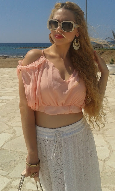Hello everyone!!! I hope that you missed me as much as I have missed you... Well, I am not going to excuse myself this time but I hope this post will be beyond your expectations for the last day of summer... An off-shoulder top in a peach colour and a white, long, maxi, lace skirt are enough to make you look like a boho princess looking for a ''Romeo'' inspired by the beautiful and very luxurious scenery. This look could definitely stand out in a Christening or even in a summer wedding in an island replacing your high heels with gold, grecian, flat sandals. How much do you like it? All of your comment are more than welcome!!!